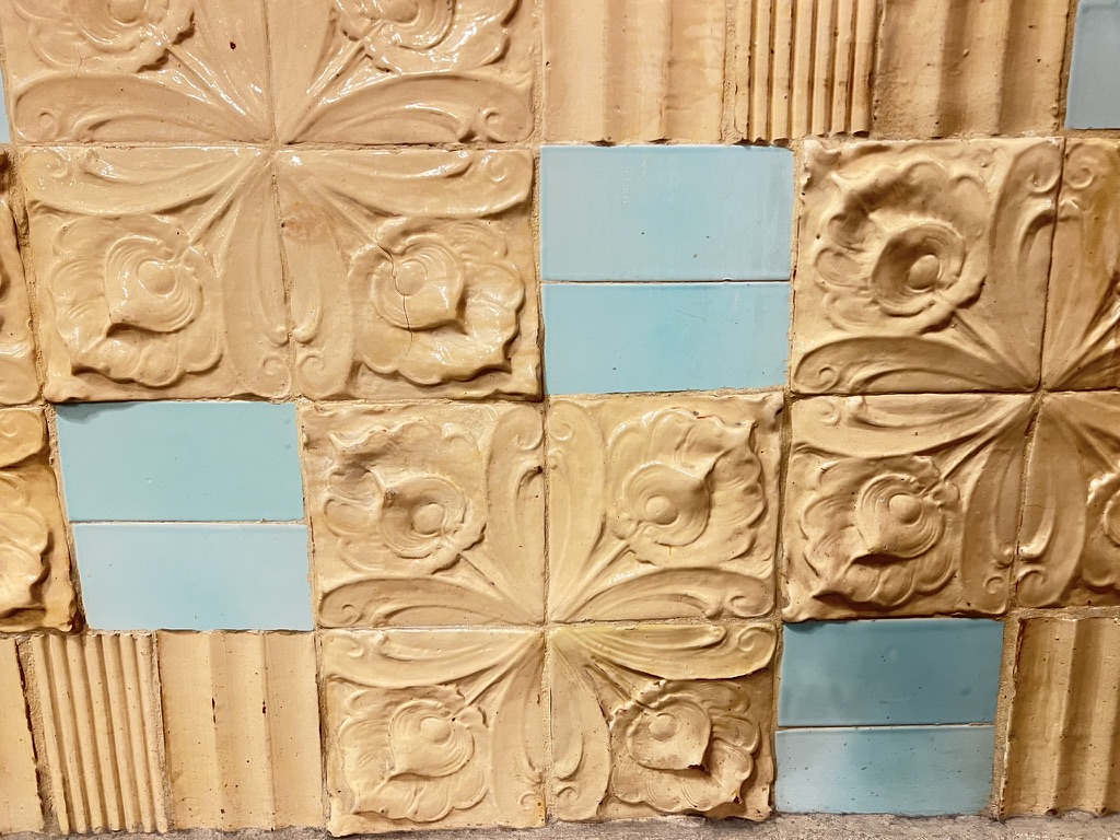 個人的にはこの階段の手すりの作りが好みでした。クリーム色の陶器のような素材をちょっとくすんだガラスで覆っているのがすごくかわいかったです。また、このクリーム色の陶器のような質感のタイルに、ティファニーブルーのタイルが混ざっている様子もとんでもなくかわいかったです。こんな家というか空間へ気軽に訪れたい。