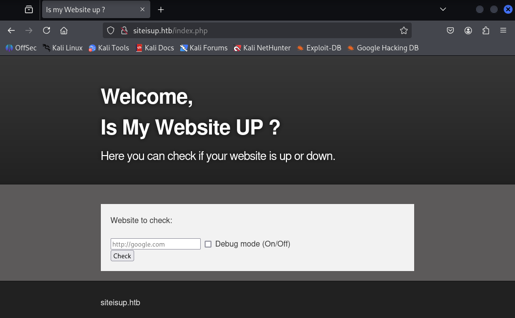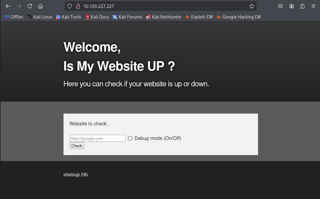 Accessing http://10.129.127.127:80 shows the siteisup.htb site.