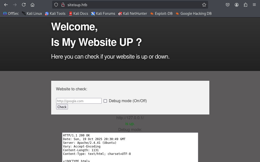 To test the web app, I supplied http://127.0.0.1/ in the input field, enabled debug mode, and inspected the result