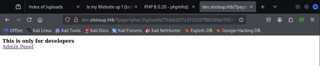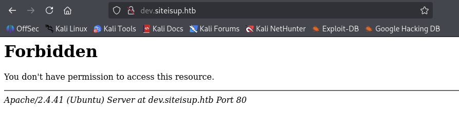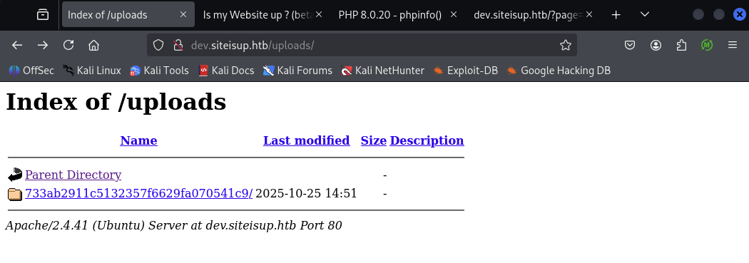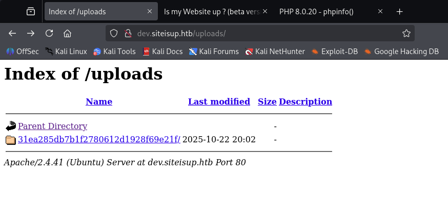 I ran feroxbuster against the site with the -x php option to enumerate .php endpoints; it returned the path http://siteisup.htb/dev/.