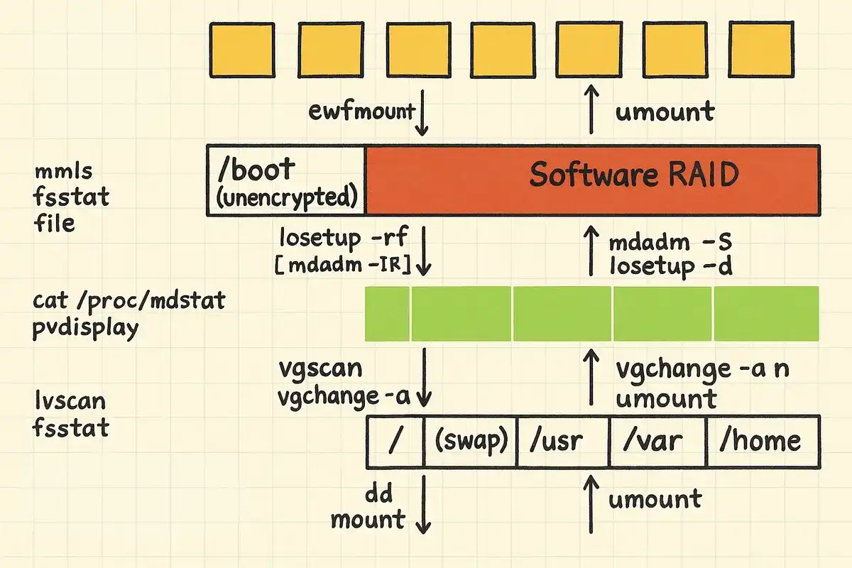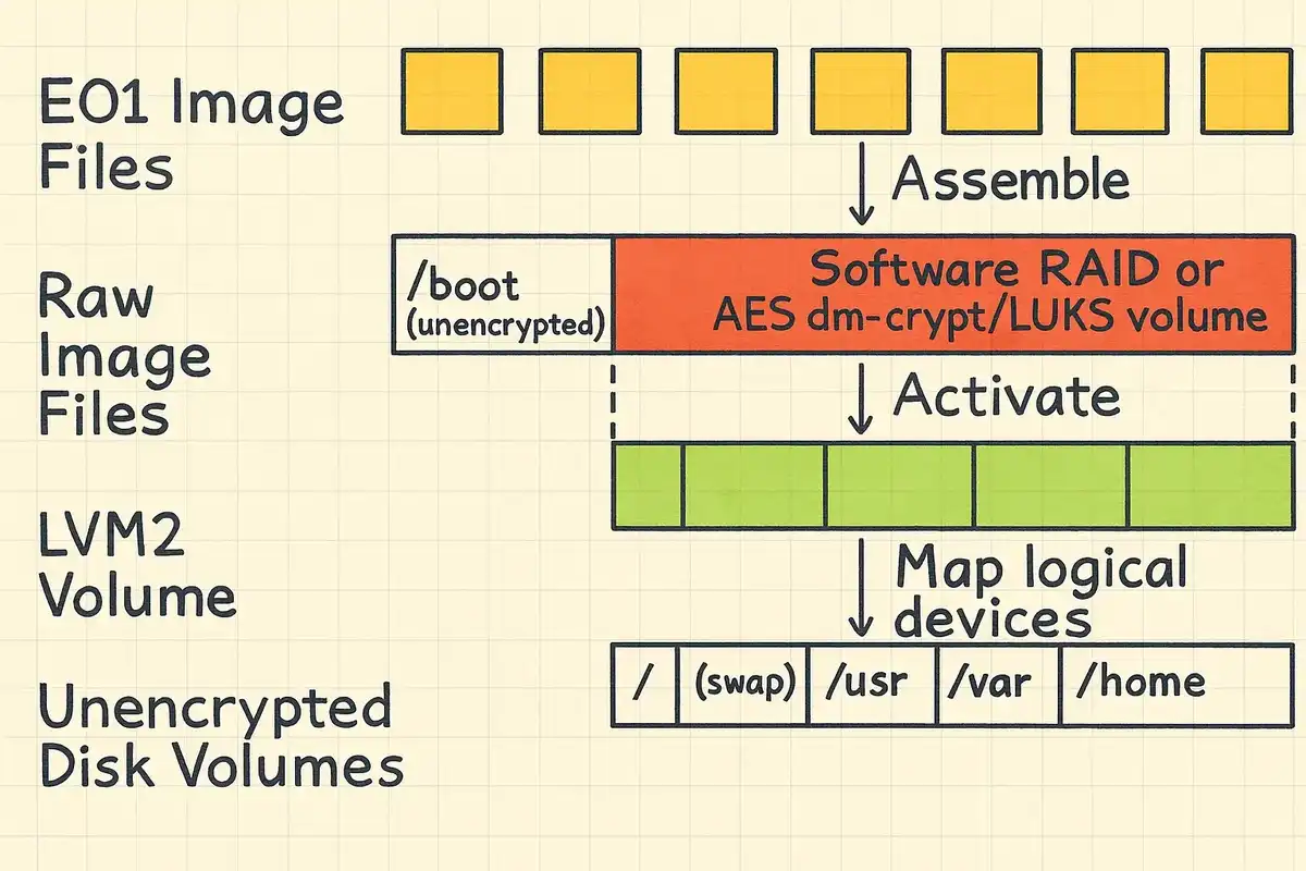 - Software RAID: Linux can assemble multiple physical disks into a logical RAID array, which must be reassembled correctly to interpret data.